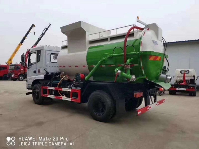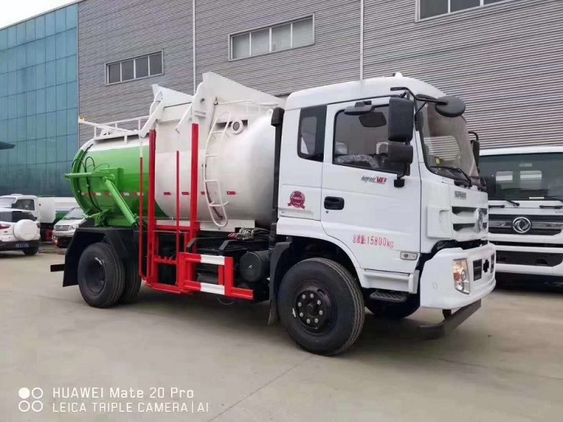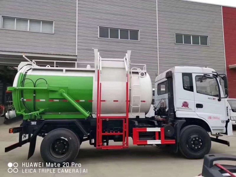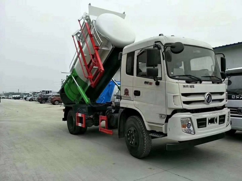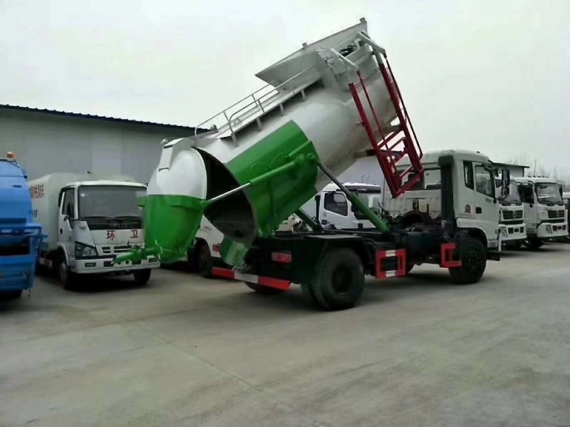圓形碳鋼罐體,罐體厚度5mm,拉桿提升機帶上蓋聯(lián)動;后蓋液壓開啟;罐體舉升自卸。選裝內軒推鏟卸料,帶渣液分離功能。餐廚垃圾車可分罐式和廂式。